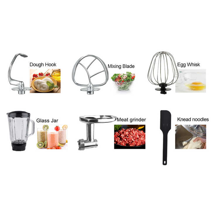 The tilting head allows quick replacement of accessories. Detachable dough hook made of all-aluminum alloy, whisk, flat mixer, shovel, easy to clean.